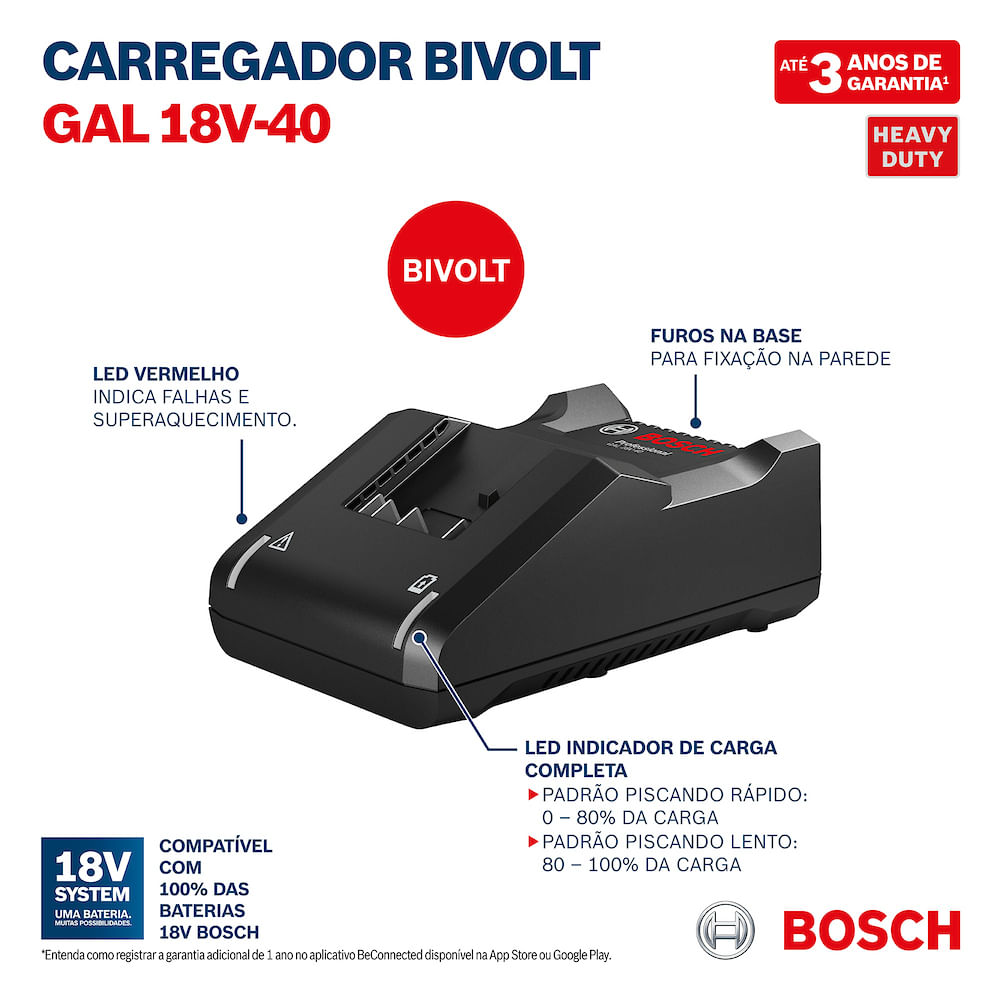 Parte da linha Bosch Heavy Duty, o GAL 18V-40 é robusto, confiável e essencial para quem utiliza ferramentas Bosch profissionais.