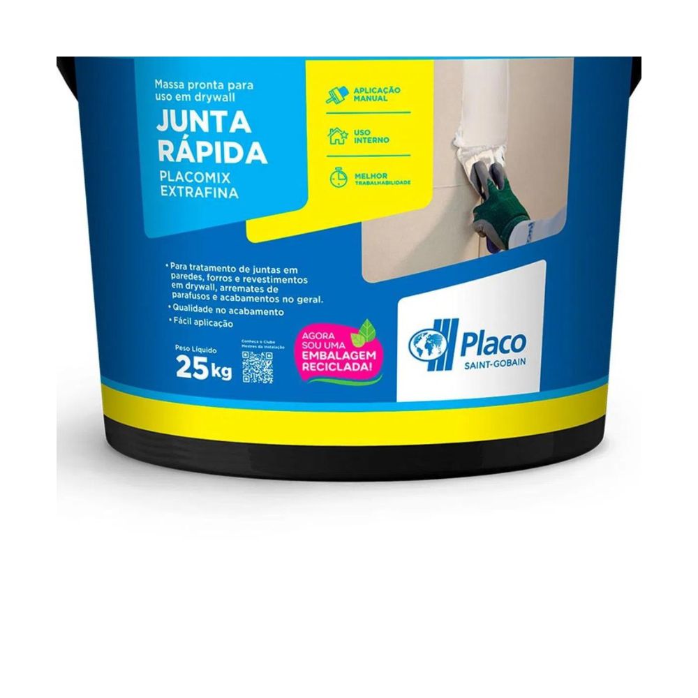 A Massa Junta Rápida Placomix Extrafina, da Placo, é uma massa especialmente desenvolvida para o tratamento de juntas em sistemas de drywall. Com fórmula extrafina, oferece um acabamento superior e de alta durabilidade, ideal para superfícies lisas e uniformes. O produto é indicado para a aplicação das juntas em ambientes internos, proporcionando rapidez na secagem e facilidade na aplicação. Além disso, pode ser aplicado em arremates de parafusos e acabamentos em geral.