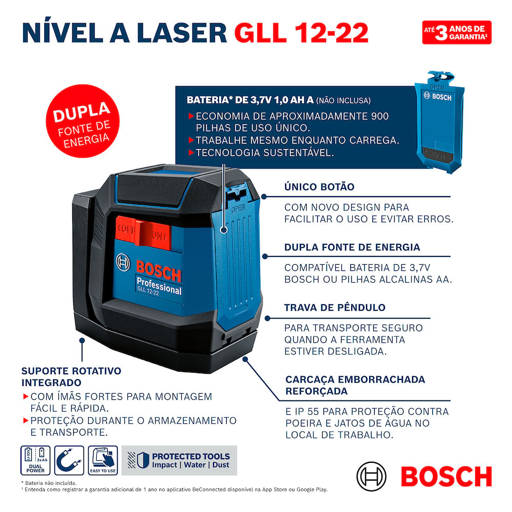 Pode ser alimentado por 2 pilhas AA (inclusas) ou bateria Bosch de íons de lítio 3,7V (vendida separadamente), proporcionando flexibilidade de uso. Acompanha bolsa de proteção e manual de instruções para facilitar o transporte e o armazenamento.