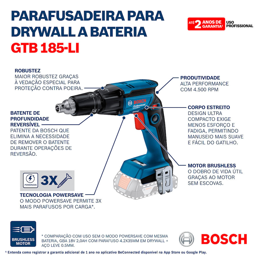 A Parafusadeira à Bateria Bosch GTB 185-LI 18V é indicada para aplicações em drywall e divisórias de compensado, oferecendo precisão, desempenho e alta autonomia. Equipada com motor Brushless, sem escovas de carvão, proporciona maior vida útil e eficiência energética, mantendo potência constante durante o uso.