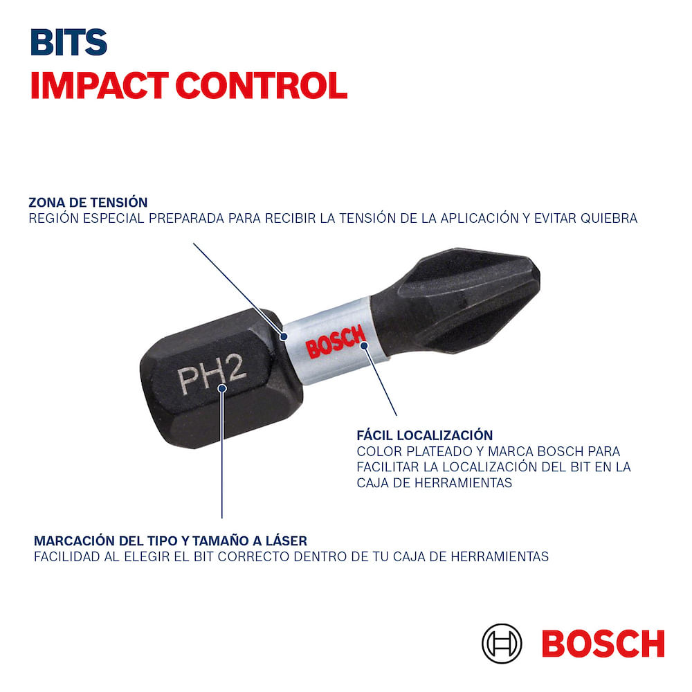 "As Pontas Bosch Impact Control foram desenvolvidas para oferecer máxima robustez e alto desempenho em aplicações de parafusamento intensivo. Com zona de torção alongada, proporcionam maior absorção de impacto, aumentando a resistência e prolongando a vida útil mesmo em trabalhos de longa duração.